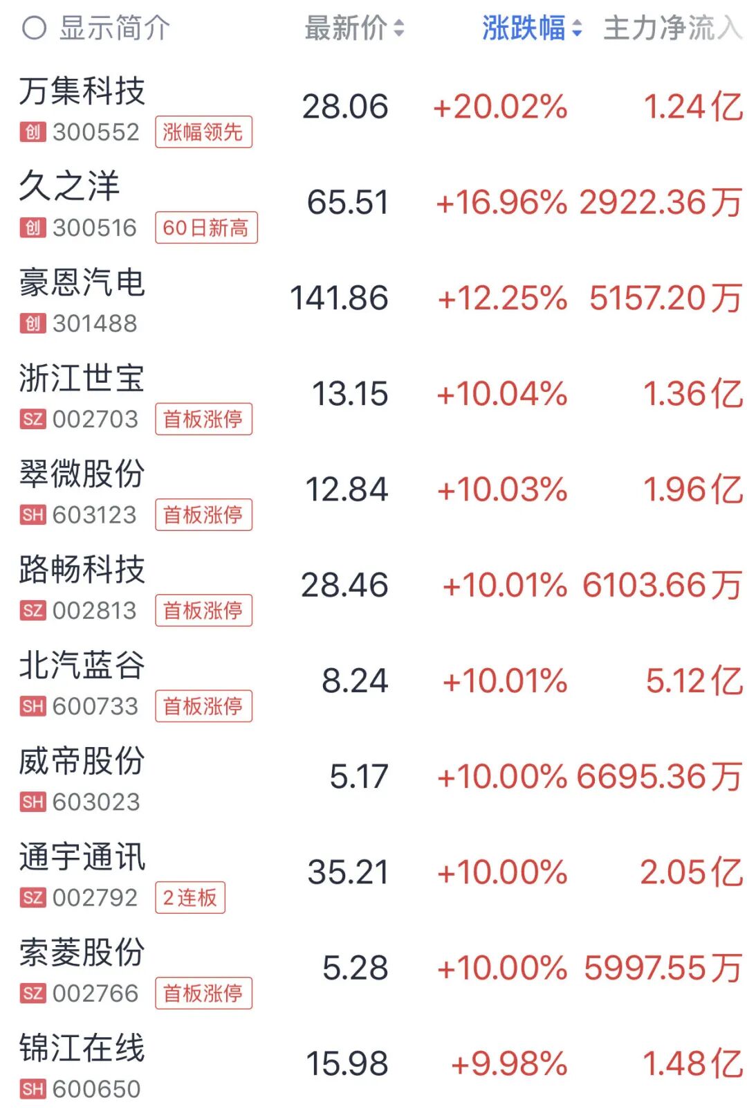 无人驾驶概念盘中表现活跃,其中,万集科技(300552)开盘1分钟20%涨停,久之洋(300516)涨近17%,浙江世宝A股、路畅科技(002813)、北汽蓝谷(600733)、威帝股份(603023)等多股涨停。
