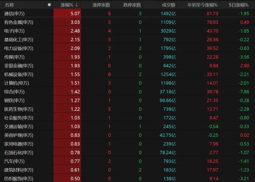 31个申万一级行业中,共计28个收涨,其中14个板块涨幅超过1%。通信板块涨幅超5%,有色金属、电子、基础化工、电力设备等板块涨幅靠前。