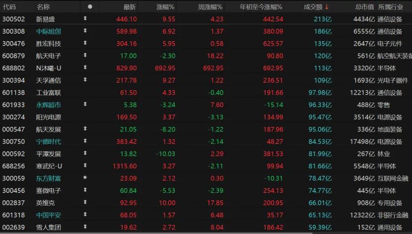 全市场3626只个股收涨,涨停股57只;1635只个股收跌,跌停股25只。CPO概念龙头股“易中天”备受资金喜爱,新易盛(300502)收涨9.55%报446.1元/股,中际旭创(300308)收涨6.92%报589.98元/股,天孚通信(300394)收涨9.27%报217.78元/股。胜宏科技(300476)、工业富联(601138)均表现不错。